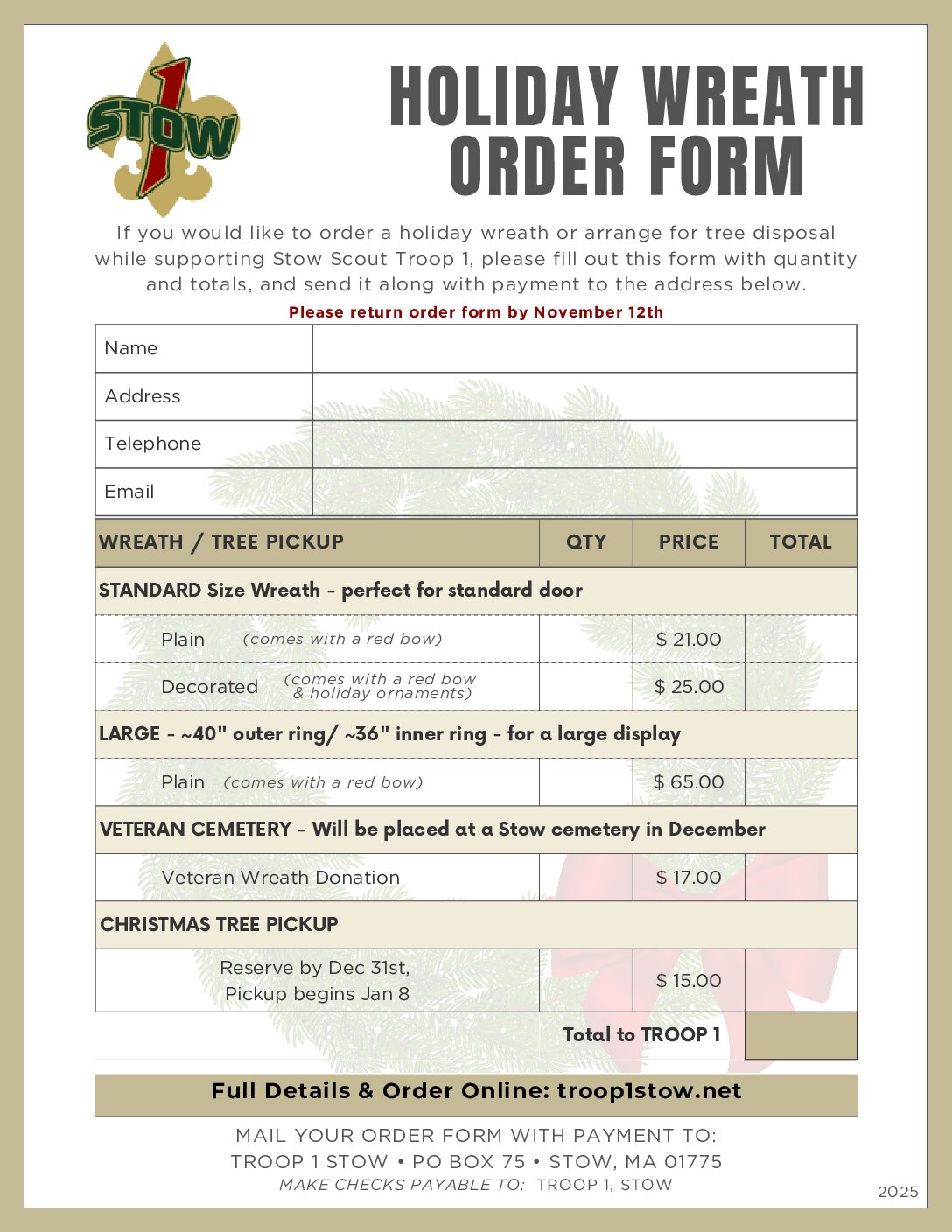 Print out our 2025 Wreath Order Form and your mail order form and check (made out to Troop 1, Stow) to the following address by Nov. 12th :