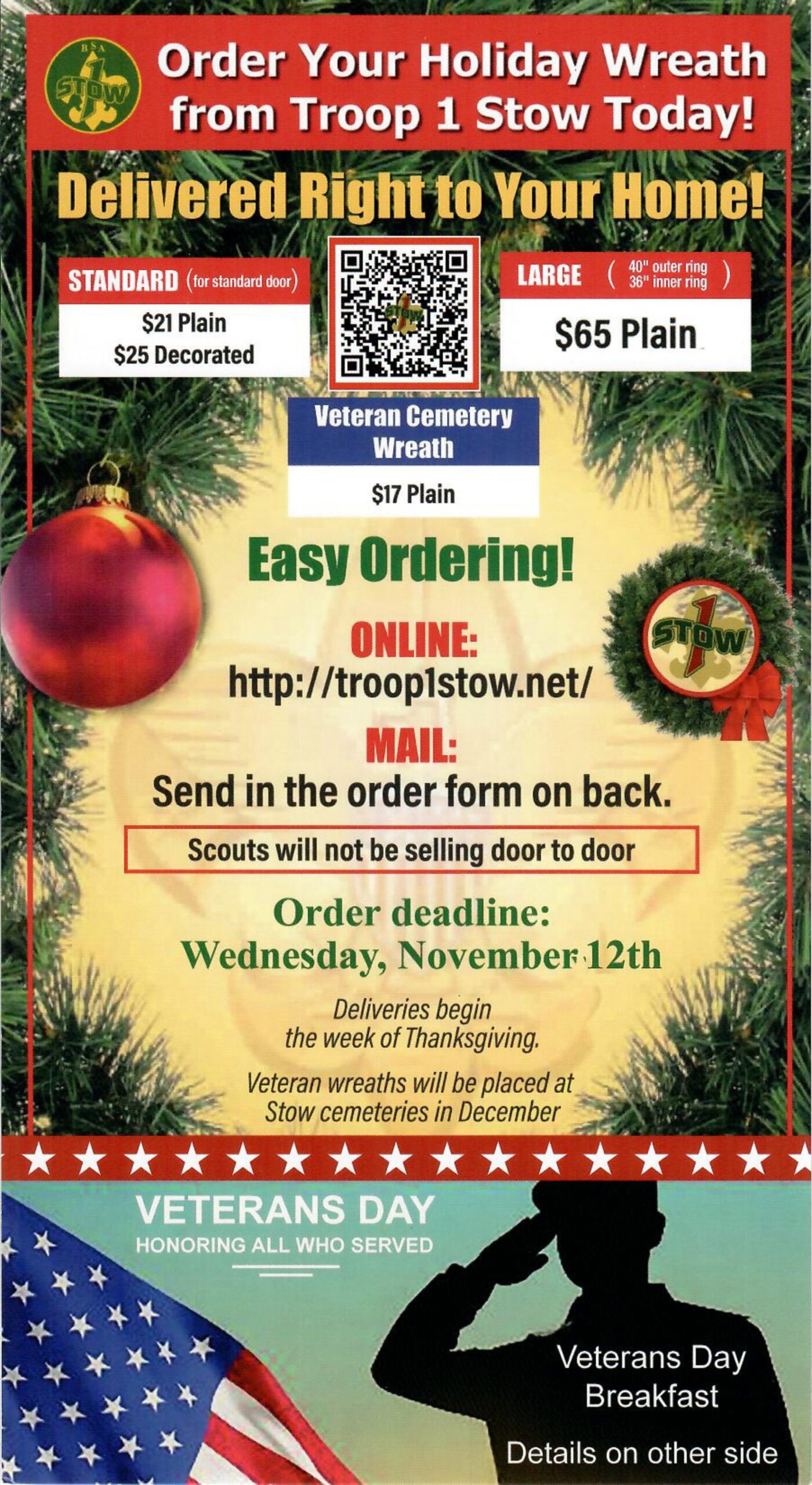 - Look for mailers sent to all Stow residents, locally placed sandwich boards, notifications in the Stow Independent, and right here on the troop website for details on when sales will be open for 2024 wreath orders.